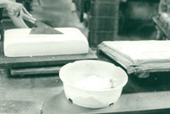さて、程野夫妻は川田のあげを学んで、萱町(かやまち)、現在の岡田印刷本社ビルの地に製造と卸の店を構えました。 この頃、干油あげは郊外の農家でも製造されていて、数件あったらしいのですが、以後、製造元は増えていません。 これには、作り方の難しさも原因だったようです。 干油あげは、普通の豆腐とは製法が異なる豆腐を3mmの厚さに切り、脱水し、あげて出来上がります。 一連の行程はかなりの熟練を要し、とりわけ、柔らかな豆腐を、包丁で数mmの厚さに切るのは芸術技ともいえるほどでした。 |